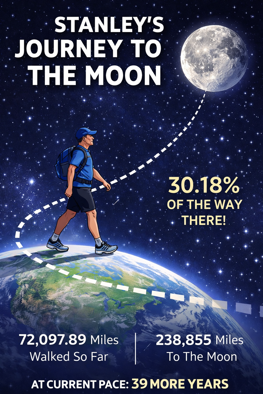 Formerly a dedicated couch potato, Stanley is now a dedicated walker who walks thousands of miles each year, and has continued to do so for the past 17 years.